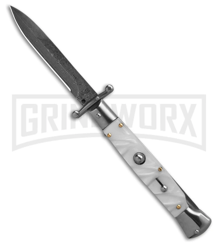 This blade boasts white Pearlex scales over stainless steel frames and liners and a Damascus steel bayonet.