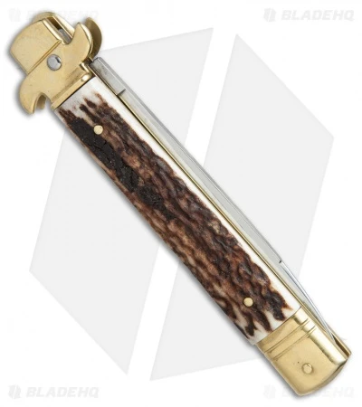 This 9″ Italian Stiletto from AKC comes in the Leverletto style with a stag horn handle and a flat grind blade with brass bolsters. AKC specializes in collectible Italian stilettos made with traditional knife-making techniques. This 9″ Leverletto model has a stag horn handle with a brass bolster. Brass pins and liners add a classic finishing touch to the design. The blade comes in a drop point style with a plain edge and a satin finish. Add classic Italian style to your collection with the AKC 9″ Leverletto stiletto.