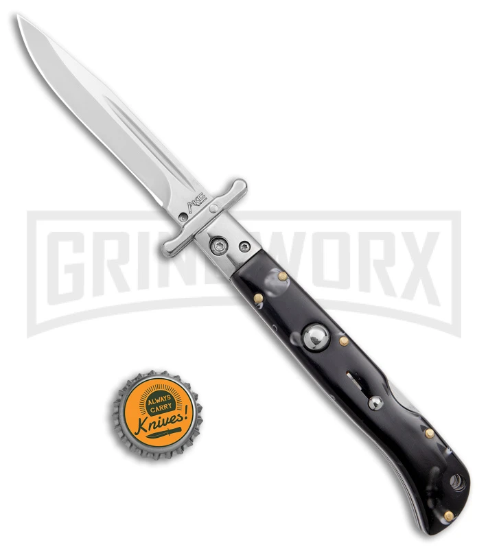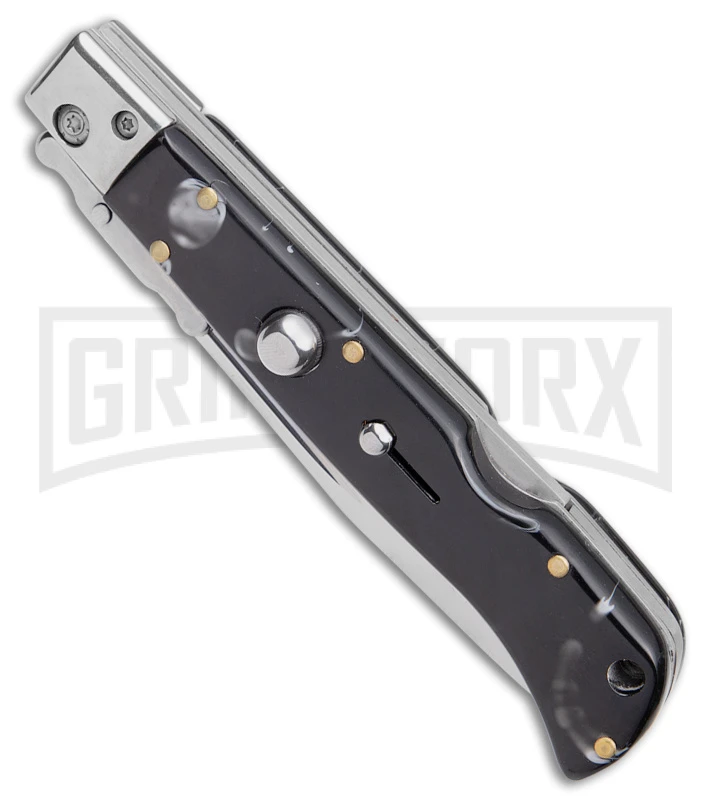 This knife has a marbled black Pearlex handle and a drop point blade.