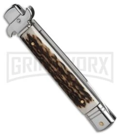 AKC 9″ Leverletto Stag Horn Brass Automatic Knife – Flat Grind